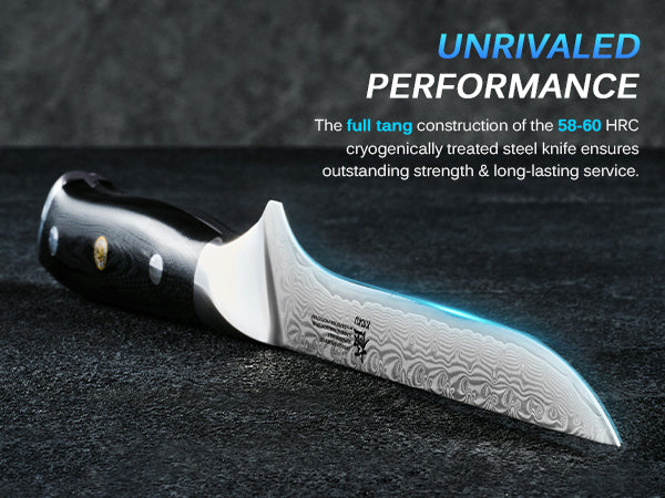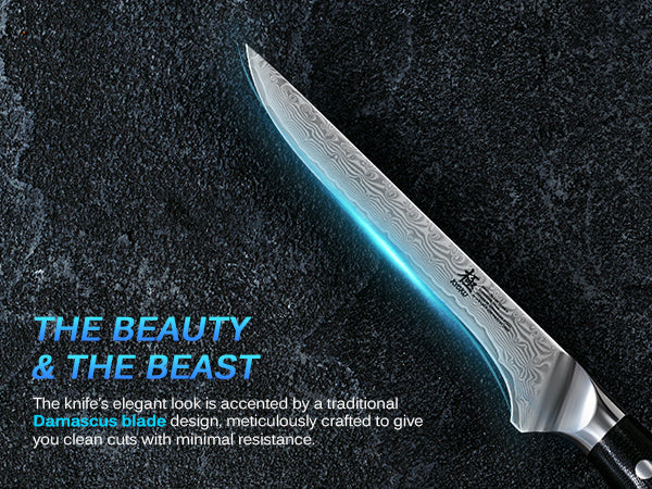 Manufactured with high-quality 67-layered stainless Damascus steel, the 7" Japanese boning knife—or "Honesuki"—is the perfect choice for meat preparation. The Japanese fillet knife's flexible blade technology ensures deboning, preparing, filleting, skinning, trimming, and butterflying your favorite meat is not only easier but also more efficient and satisfying.