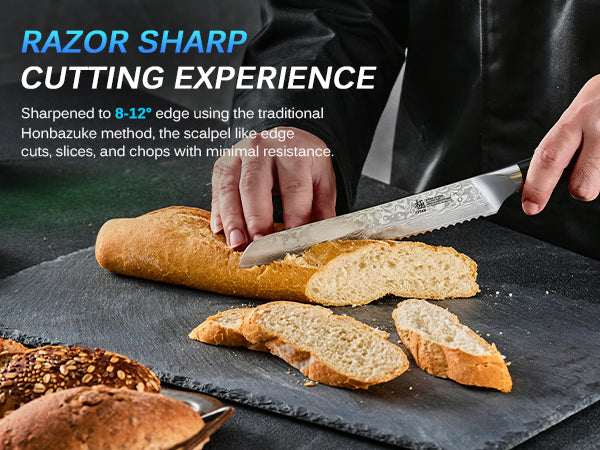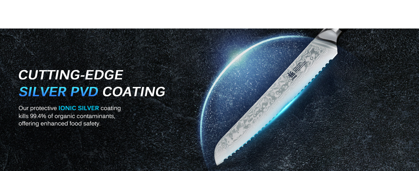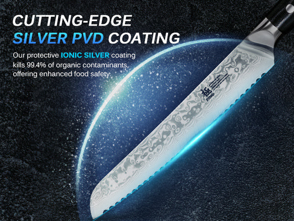 This bread knife is a perfect fusion of tradition and technology, featuring cryogenically treated Japanese VG-10 steel and an innovative ionic silver coating for unrivaled hygienic performance.