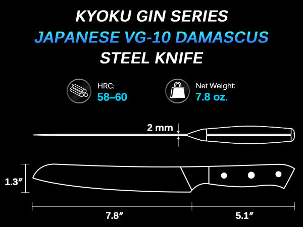 The knife is made with Japanese VG-10 steel and coated with ionic silver. It also has a full tang construction and a blade made of 58-60 HRC Damascus steel.