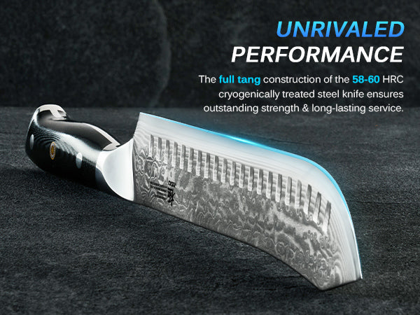 No detail is amiss, from the full tang construction to the 58-60 HRC Damascus steel blade, from the comfy fiberglass handle to the elegant mosaic pin. This professional grade butcher knife comes complete with its sheath and case to preserve and store it with care.