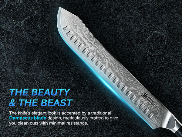 Manufactured with ultra-premium 67-layered stainless Damascus steel at HRC 58-60 hardness. The cobalt added steel outperforms AUS-10 steel in durability and is easier to sharpen, since cobalt enhances the other alloying elements.