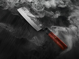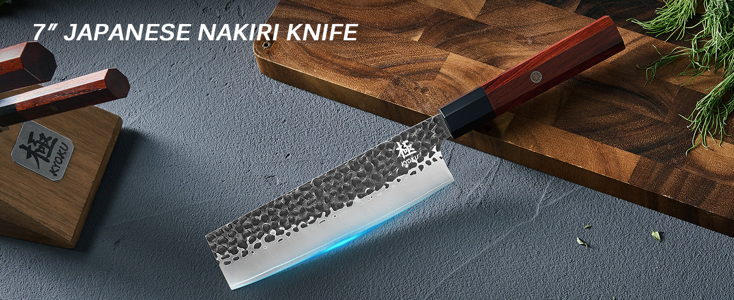 Finding regular cleavers too heavy to handle? Try Kyoku's nakiri knife—lighter and easier to control. With its 13-15 degree razor-sharp edge, comfortable rosewood handle, and agile 3-layer laminated steel blade, this knife is perfect for chopping, slicing, and dicing vegetables like herbs and leafy greens, as well as boneless meats and fish. The wide blade also offers a large surface area, making it easy to scoop and transfer chopped ingredients from the cutting board to the pan. Packaged in an elegant gift box, this vegetable cleaver is an ideal gift for any chef or cooking enthusiast. Say goodbye to dull kitchen knives and elevate your daily meal prep with Kyoku's 7" nakiri knife!