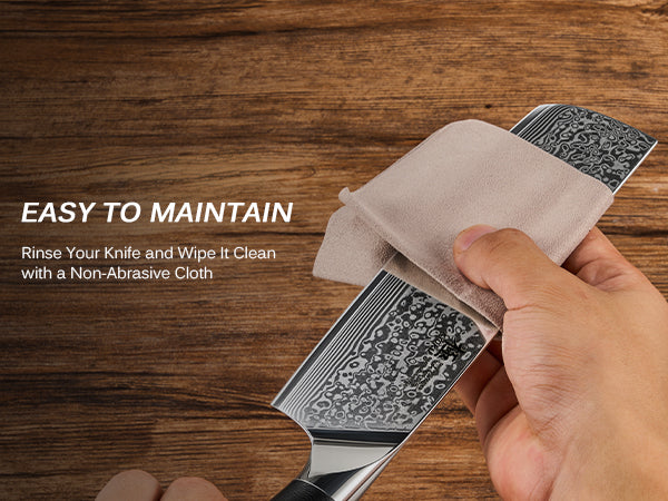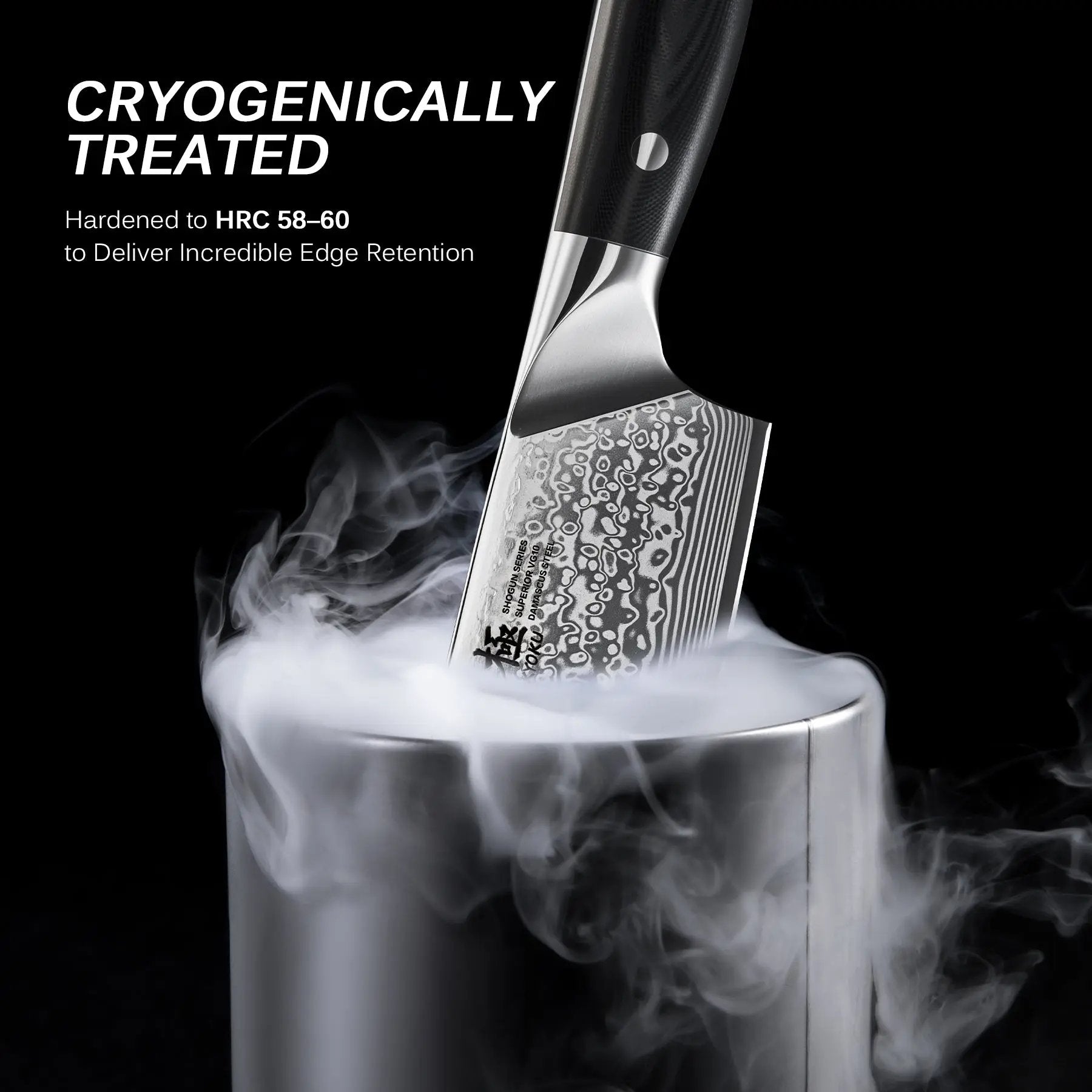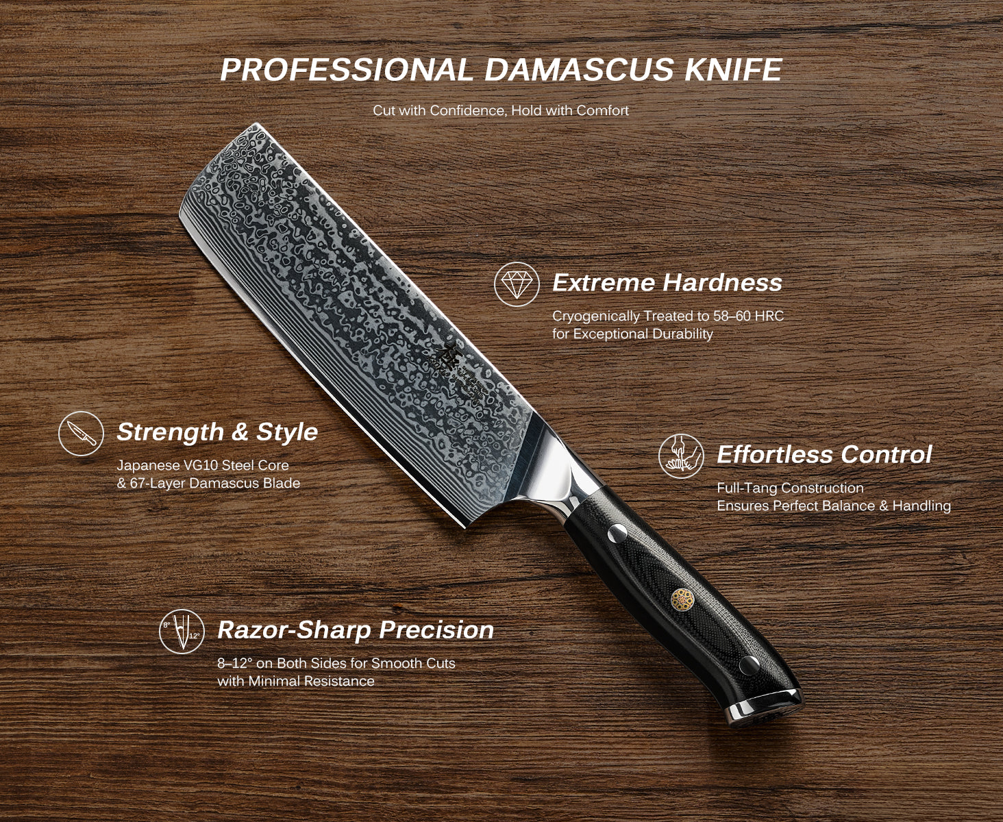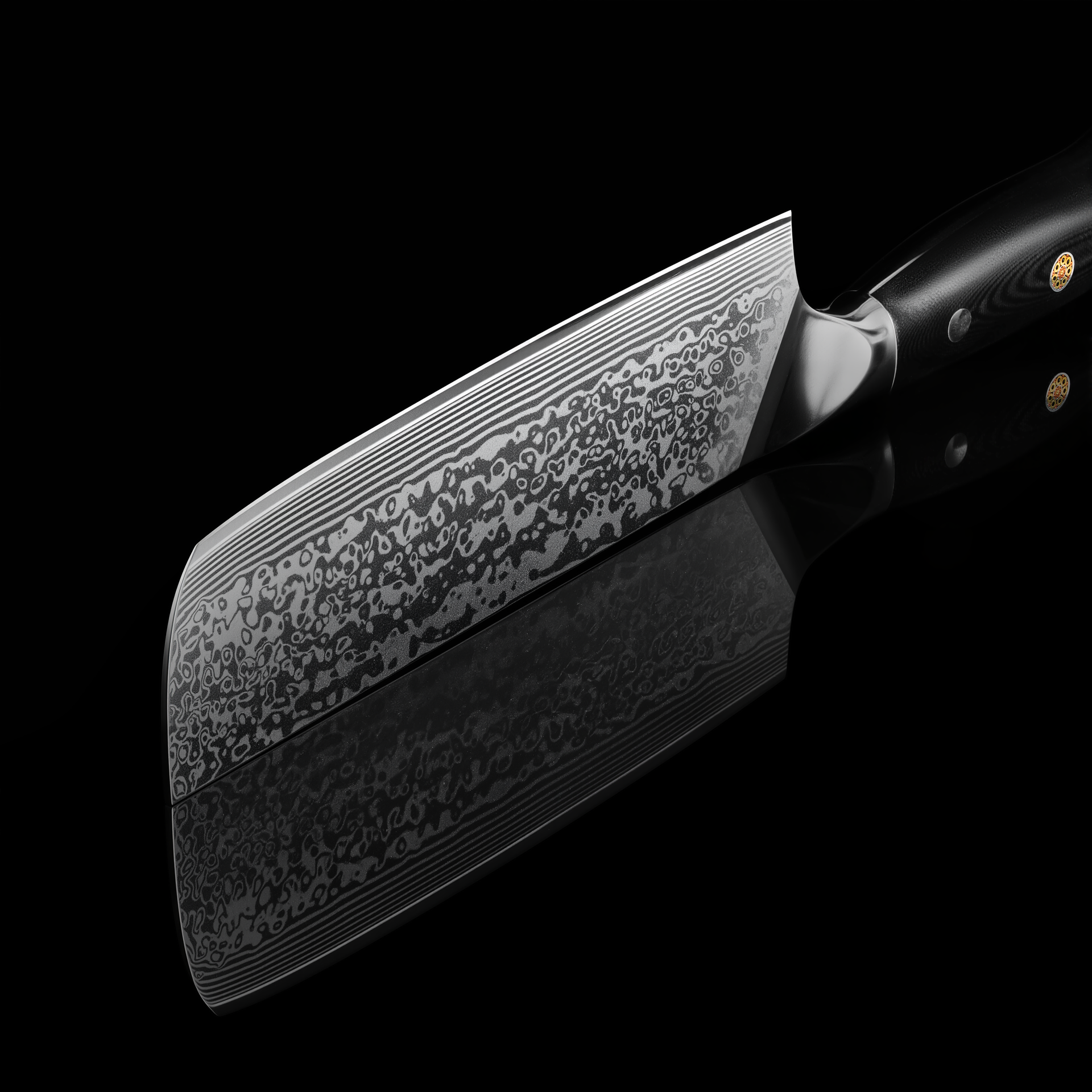 Manufactured with ultra-premium 67-layered stainless Damascus steel at HRC 58-60 hardness. The cobalt added steel outperforms AUS-10 steel in durability and is easier to sharpen, since cobalt enhances the other alloying elements.