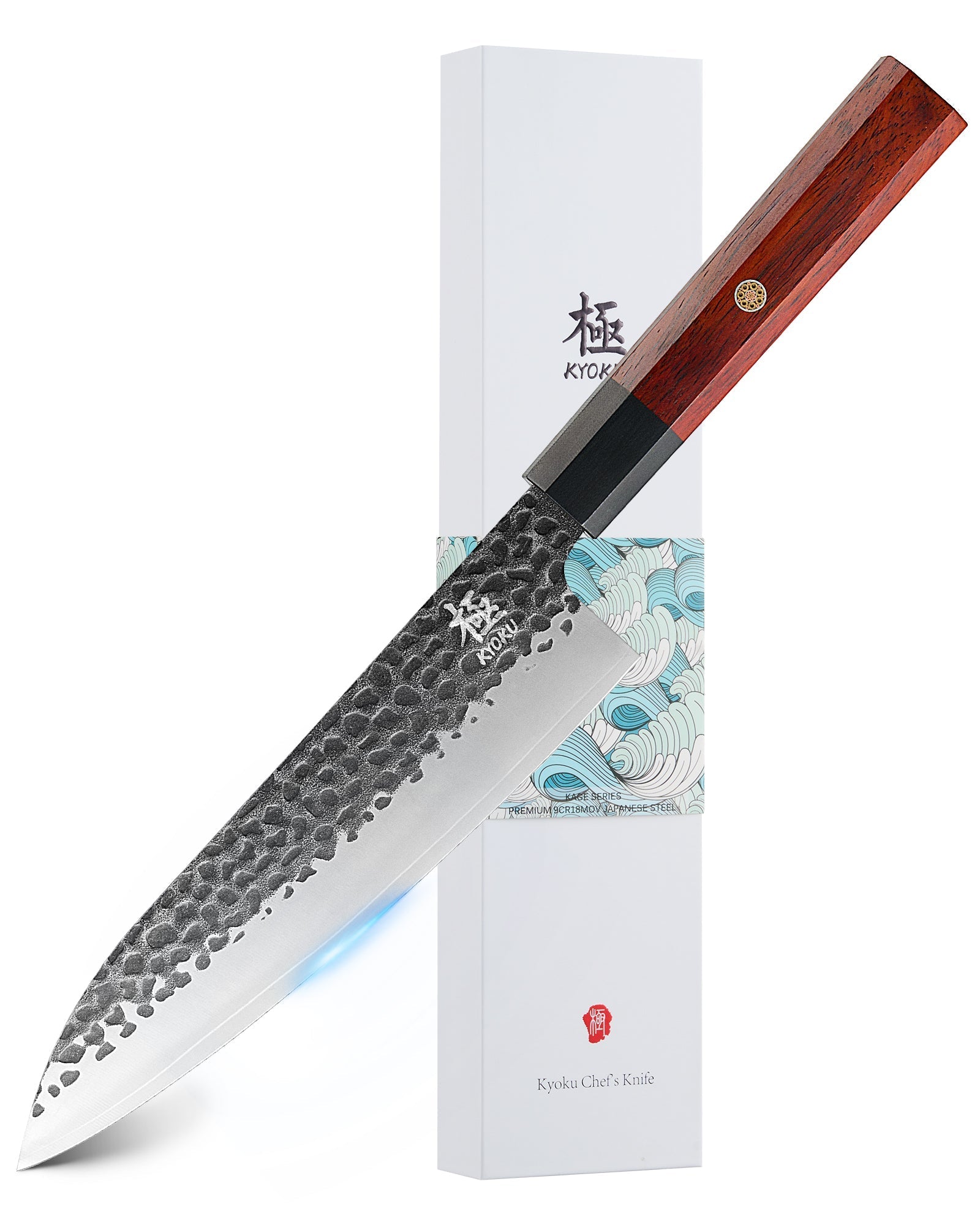 Kyoku’s Kage Series knives are crafted with precision and designed to balance style and performance. Featuring a 3-layer laminated steel blade, a striking hammered pattern, and an ergonomic rosewood handle, these knives deliver sharpness, durability, and comfort. Additionlly, packaged with a gift box, they are ideal for both personal use and gifting.