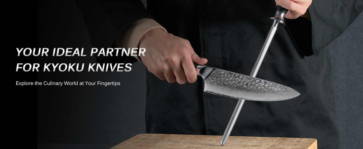 Looking for the perfect tool to keep your knives sharp for any cooking task? Look no further than Kyoku's 10 in. honing steel from the Shogun Series. Crafted from chrome-plated carbon steel with a 62 HRC rating, this knife sharpener is designed for daily use, ensuring your knives stay razor-sharp and perfectly aligned. Its ergonomic G10 fiberglass handle with a metal hand guard and signature mosaic pin offers a comfortable grip for extended use. With an optimal 10 inch length, it's versatile enough for all your kitchen knives. Plus, it comes in an elegant gift box, making it a great present for any aspiring chef or a valuable addition to your kitchen.