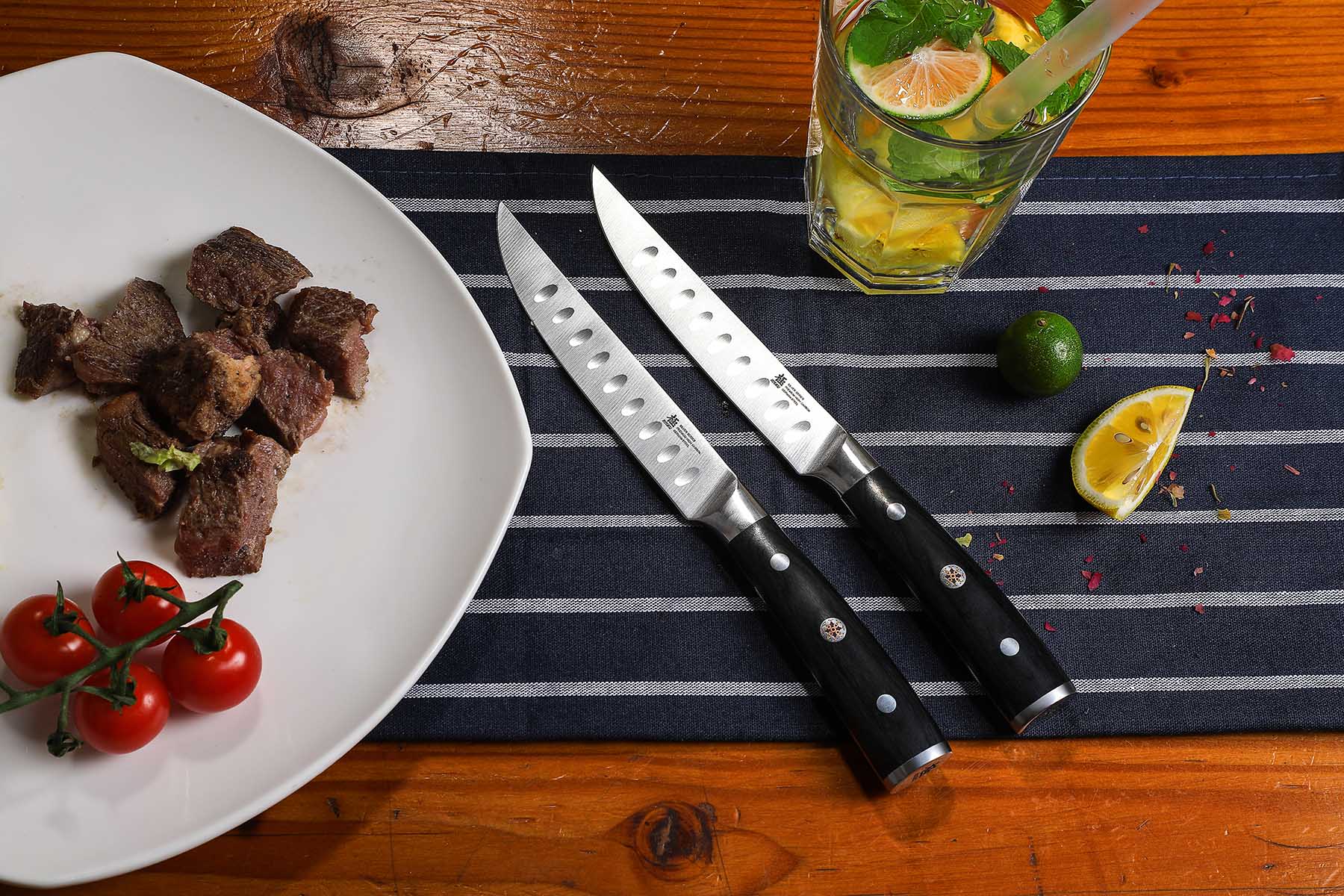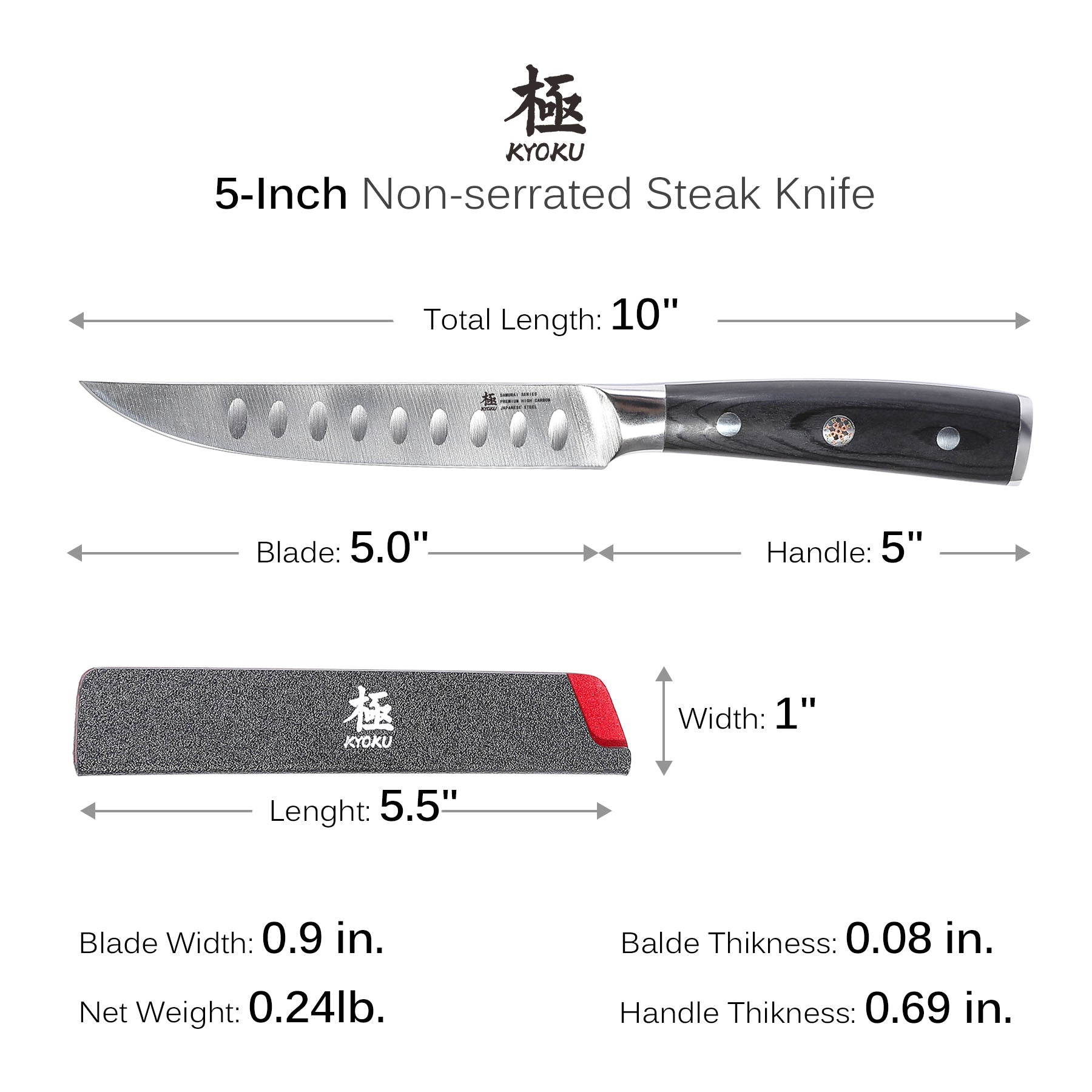A perfect fusion of tradition and technology, this 5 inch table and kitchen knife set is manufactured with cryogenically treated German 4116 steel to ensure outstanding durability. Thanks to their scalpel like non serrated edges, these steak knives slice with minimal resistance, making them perfect for cutting any meaty dish with meticulously exact precision. No detail is amiss, from the 56-58 HRC high carbon steel blades to durable pakkawood handles with elegant mosaic pins. This professional grade knife set comes complete with knife sheaths and a case to preserve and store it with care.