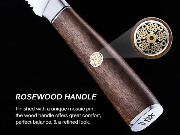 A perfect fusion of tradition and technology, this 4 piece steak knife set is manufactured with vacuum heat-treated Japanese stainless steel to ensure outstanding durability. Thanks to their scalpel-like 13-15 degree edges, they slice with minimal resistance, making them perfect for cutting any meaty dish with meticulously exact precision, from large juicy steaks to tender chicken breast. This table knife set's 440C steel’s 59-60 Rockwell hardness provides unrivaled performance, superior corrosion resistance, and exceptional edge retention. The durable rosewood handles are impervious to heat, cold, rust, and moisture while also boasting great comfort and perfect balance, preventing fatigue and cramp even while slicing through the thickest cuts of rib-eye steak. No detail is amiss, with a touch of elegance from the unique mosaic pins in the center of the handles. These graceful pieces of kitchen equipment look beautiful on any dinner table and in any kitchen decor. Our kitchen knives come complete with their own sheathes and a case to preserve and store them with care.