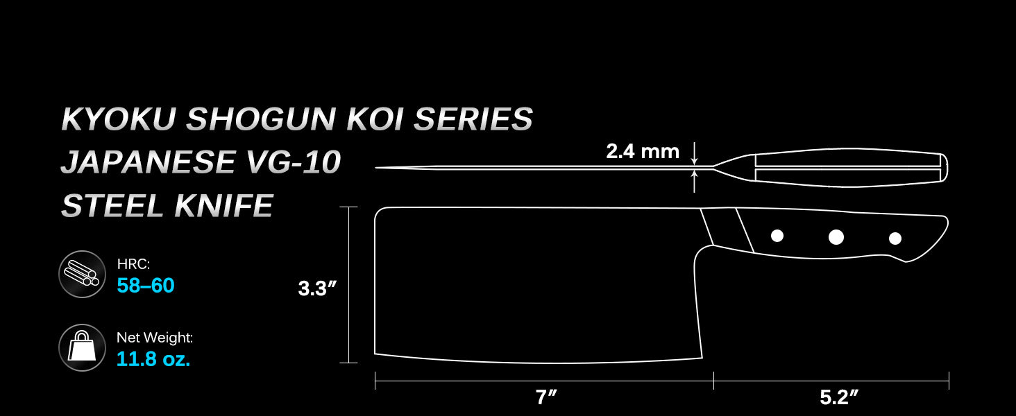Discover the precision and beauty of our Koi Series 7" Cleaver Knife. Handcrafted with Japanese steel, this professional kitchen knife effortlessly chops and slices vegetables with its sharp VG10 blade and full tang design. It comes in a sleek gift box with a protective sheath for safe storage. Upgrade your cooking game today!