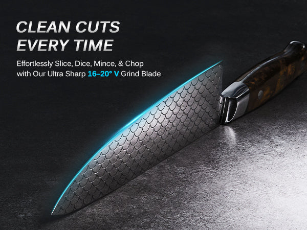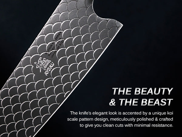 The mesmerizing koi scale design on this knife blade isn't just for show—it's engineered to prevent food from sticking, making your kitchen tasks a breeze. Thanks to its scalpel-like edge, this Japanese professional kitchen knife can easily mince, chop, cut, and slice fruits, vegetables, and meat with minimal resistance.