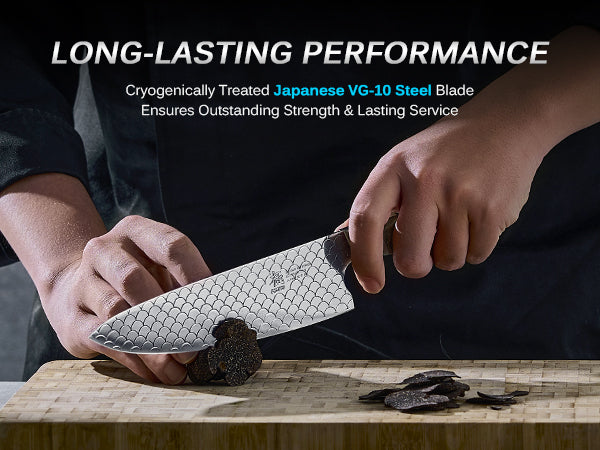- Razor Sharp Blade: Crafted from Japanese VG-10 stainless steel with 58-60 HRC, this kitchen knife features a blade precisely honed to an angle of 16-20 degrees while boasting exceptional corrosion resistance for reliable and long-lasting performance.