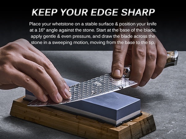 Treat your knife with care! Hand wash it with mild soap, dry it immediately, and store it in a knife block or on a magnetic strip. Sharpen it regularly to keep it in top shape and avoid using it on hard surfaces.