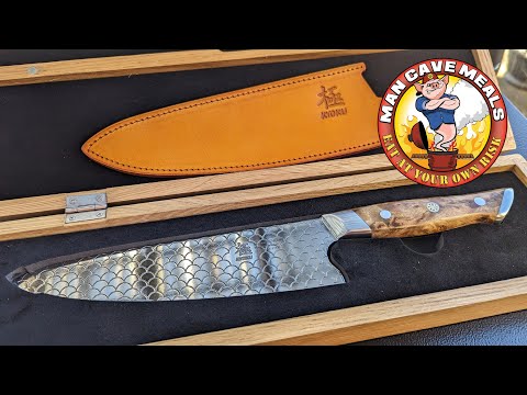 No detail is amiss, from the full-tang construction to the 58-60 HRC Japanese steel blade, from the comfy camphorwood handle to the elegant mosaic pin. This professional-grade meat-cutting knife comes complete with its own leather sheath and wooden gift box to preserve and store it with care. Enjoy this perfect chef's knife for professional chefs and home cooks, from commercial kitchens to home kitchens, and add it to your collection today!