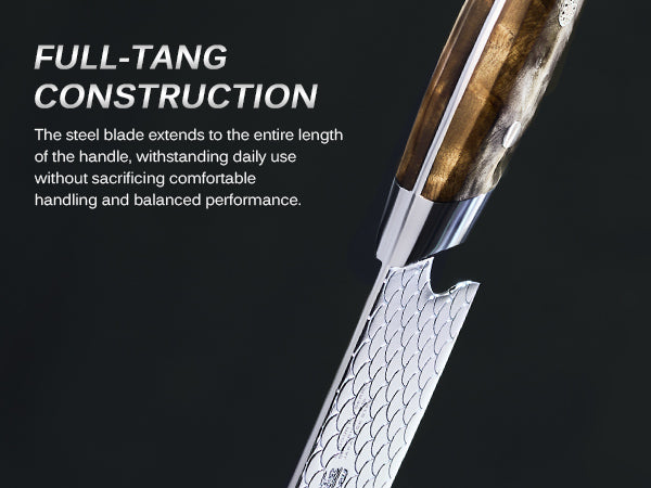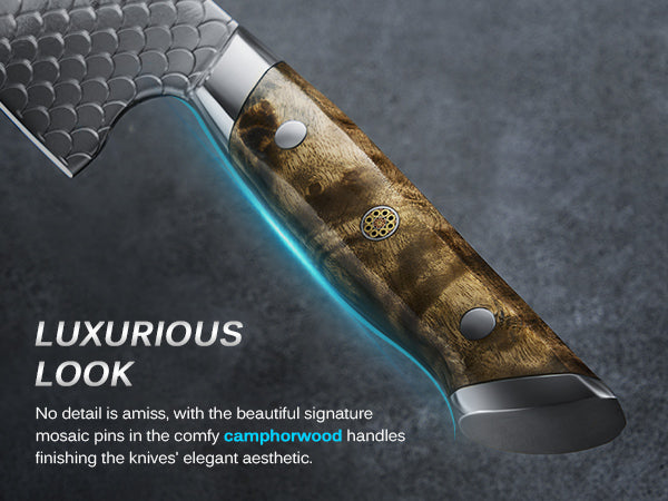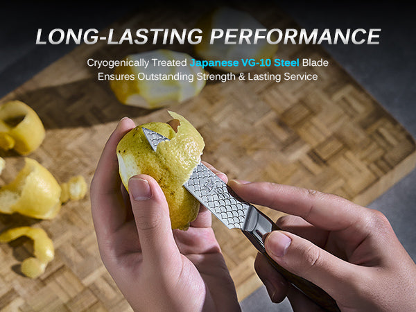 A perfect fusion of tradition and technology, this 3.5 inch peeling knife is manufactured with Japanese VG-10 stainless steel to ensure outstanding durability. The mesmerizing koi scale design on this knife blade isn't just for show—it's engineered to prevent food from sticking, making your kitchen tasks a breeze. Thanks to its scalpel like edge, this Japanese professional kitchen knife can easily slice, peel, and core fruits with minimal resistance. No detail is amiss, from the full tang construction to 58-60 HRC Japanese steel blade, from the comfy camphorwood handle to elegant mosaic pin. This professional grade small kitchen knife comes complete with its own leather sheath and wooden gift box to preserve and store it with care.