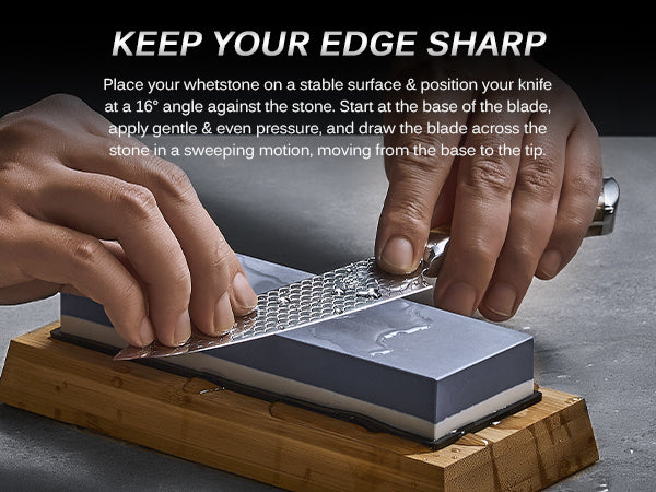 Treat your knife with care! Hand wash it with mild soap, dry it immediately, and store it in a knife block or on a magnetic strip. Sharpen it regularly to keep it in top shape and avoid using it on hard surfaces.