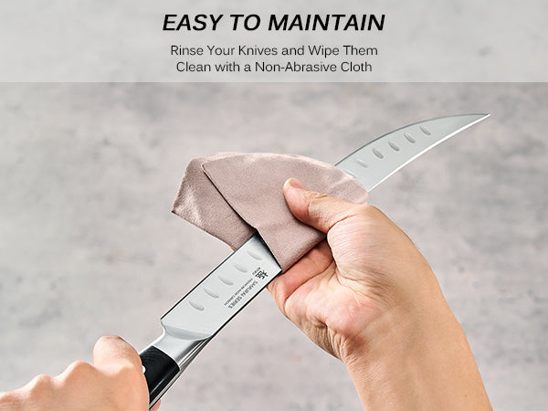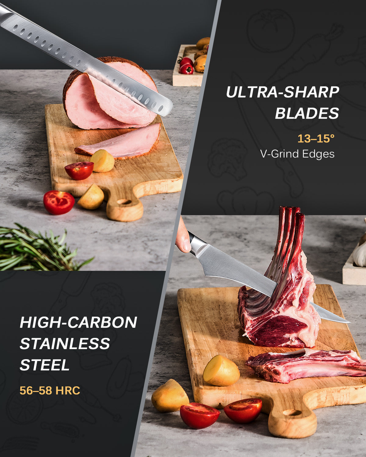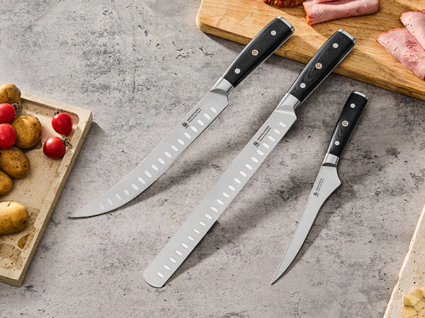- Ultra-Sharp Blades: This Japanese carving knife set's razor-sharp blades are precisely honed to 13-15 degrees, making them perfect for gliding through meats, dicing vegetables, breaking down cuts, and tackling delicate prep