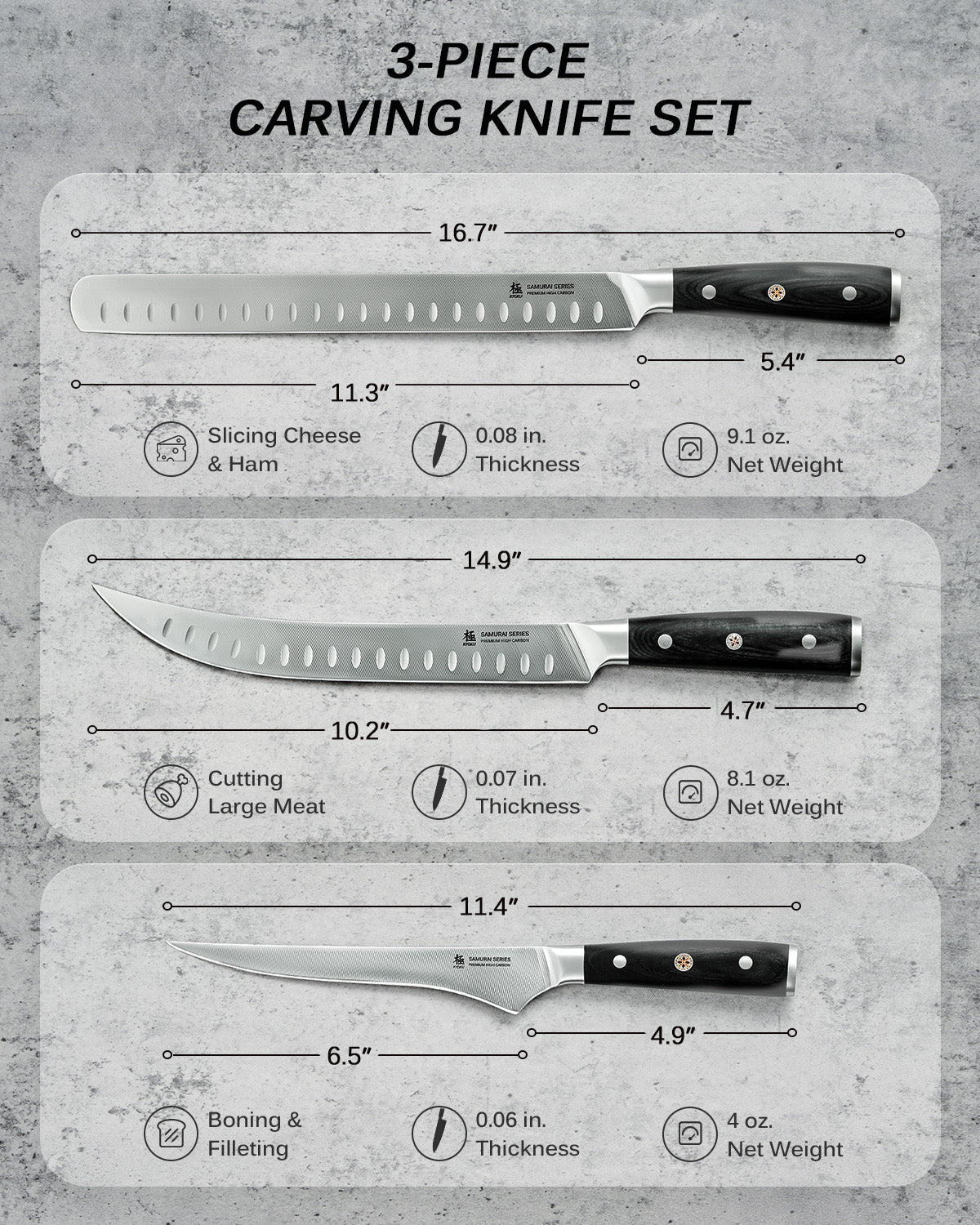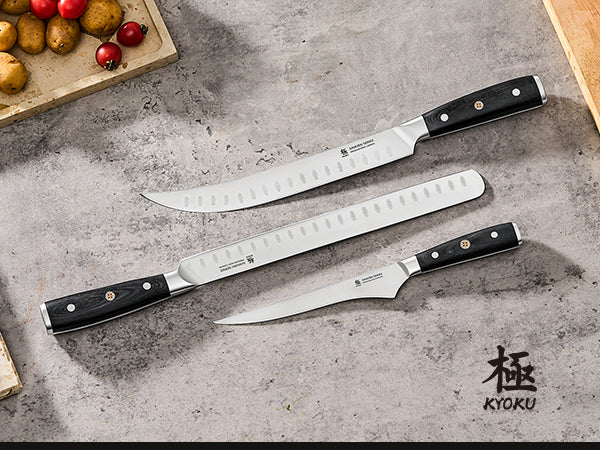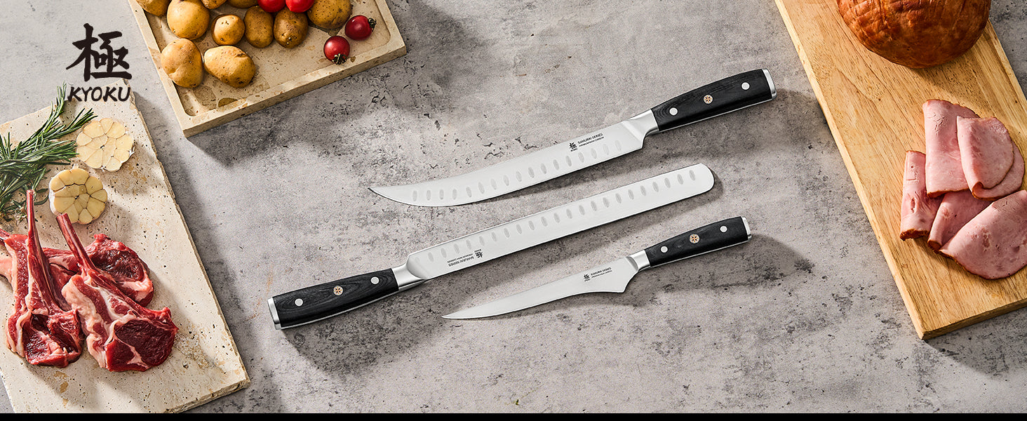 - 3-Piece Professional Knife Set: Kyoku's 3 pc. kitchen knife set from Samurai series includes a 6.5 in. boning knife, 10 in. butcher knife, & 12 in. slicing knife, all featuring full tang construction for enhanced balance and long-lasting strength