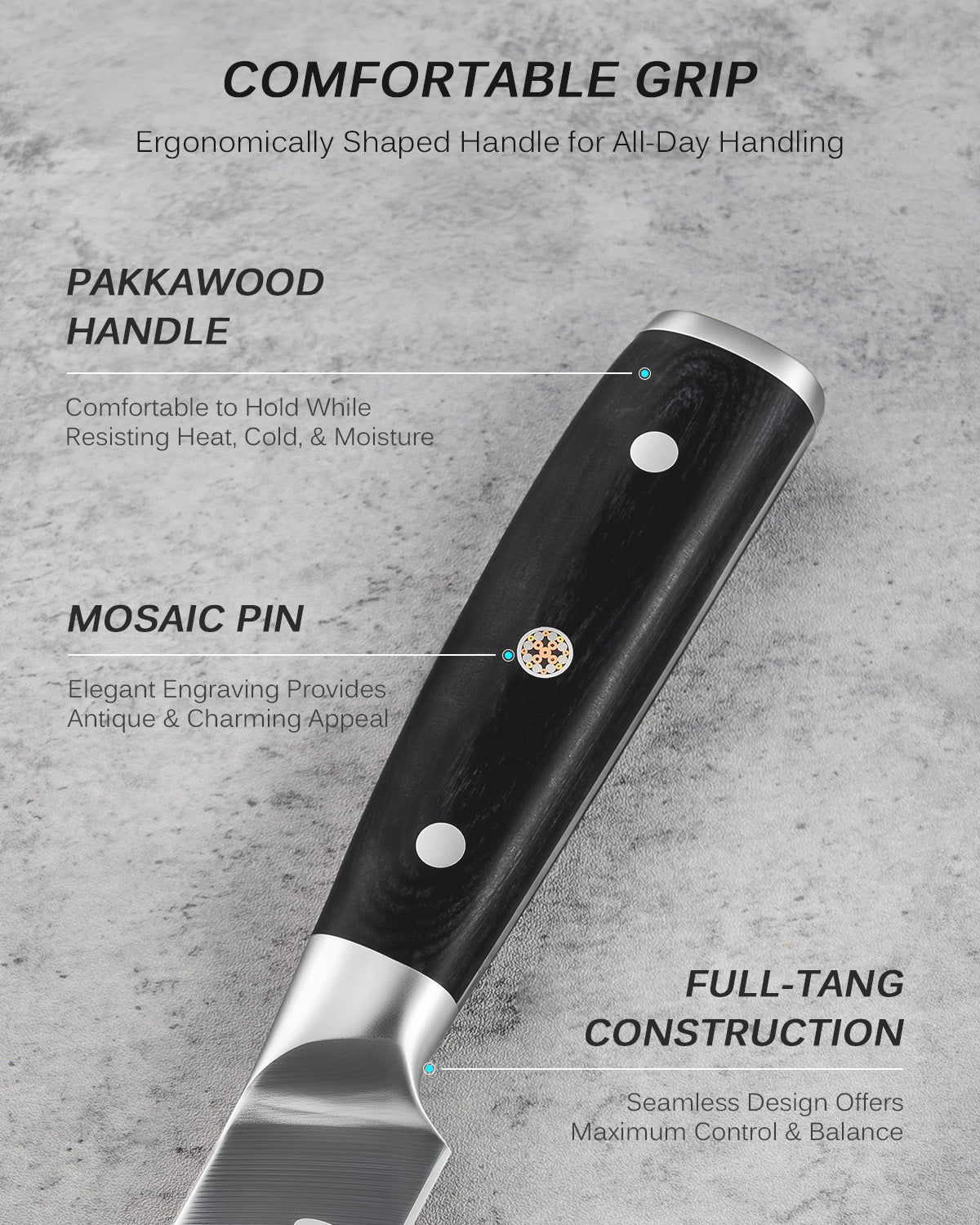- Ergonomic Grip: Our pakkawood handles are expertly shaped for comfort and durability. They resist heat, cold, and moisture while providing excellent balance and control, even during extended use