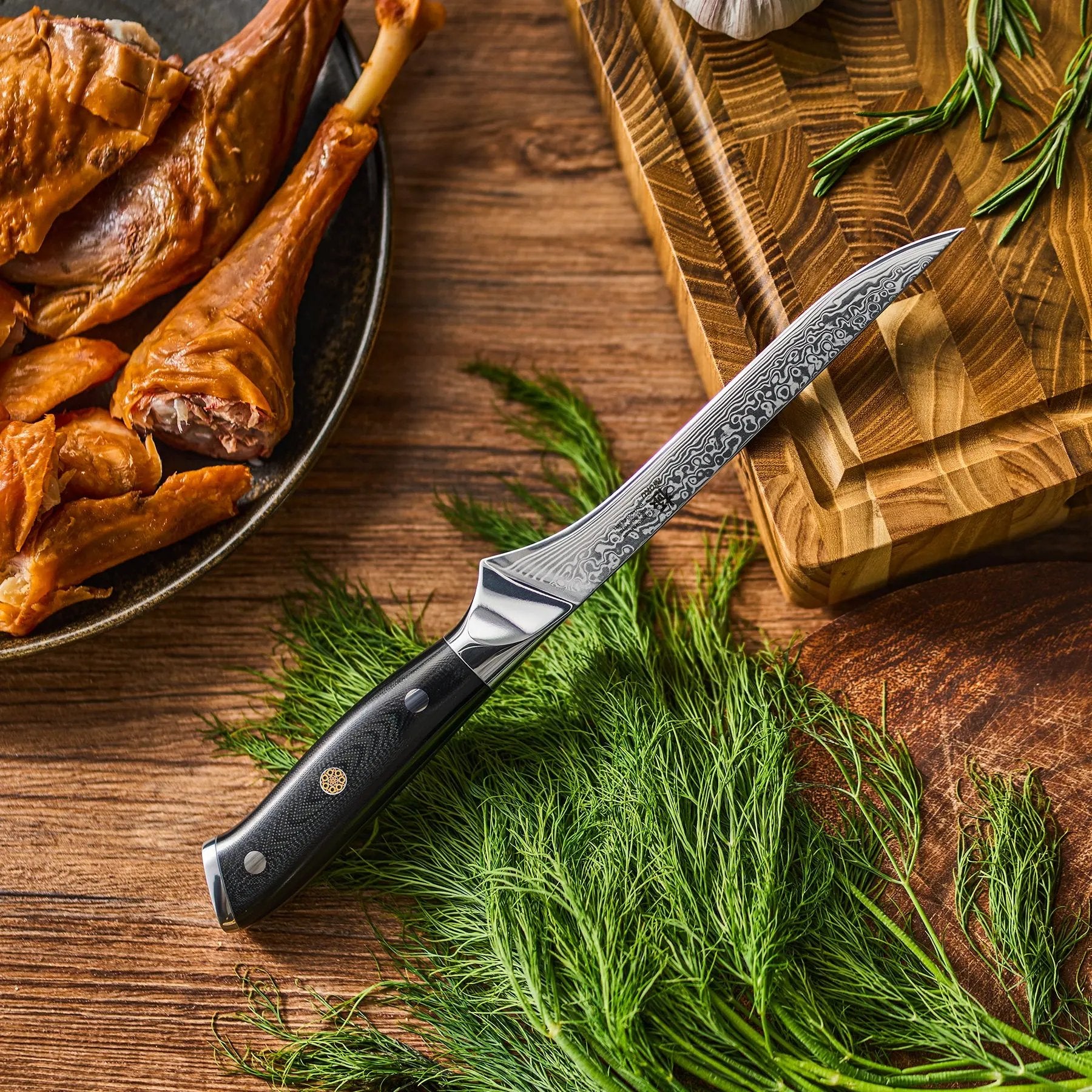 Manufactured with high-quality 67-layered stainless Damascus steel, the 7" Japanese boning knife—or "Honesuki"—is the perfect choice for meat preparation. The Japanese fillet knife's