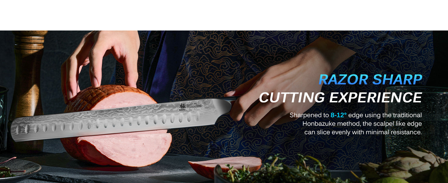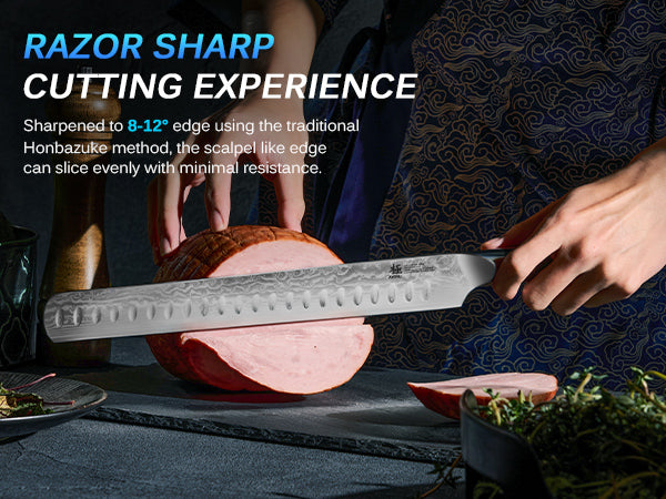 - ULTRA-SHARP BLADE: Sharpened to 8 to 12 degrees on each side using the traditional 3-step Honbazuke method, this carving knife's long blade and indentation are perfect for cutting even and thin slices through large cuts of meat, fruit, and vegetables