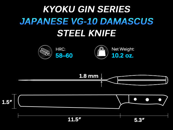 The knife is made with Japanese VG-10 steel and coated with ionic silver. It also has a full tang construction and a blade made of 58-60 HRC Damascus steel.