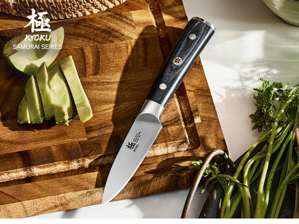 - 3.5" Paring Knife: Kyoku's 3.5" paring knife from the Samurai Series is expertly crafted with Japanese high-carbon steel for superior performance and durability. With its sharp blade, this knife is perfect for slicing, peeling, and trimming.
