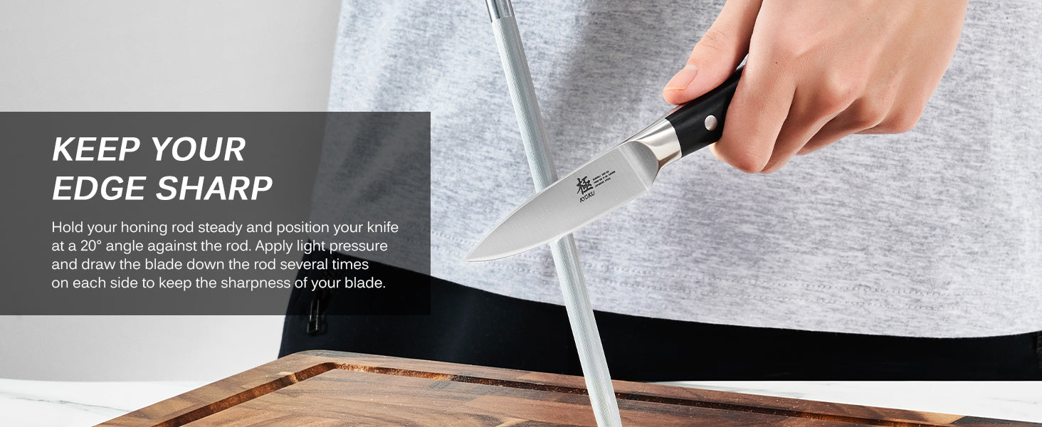 The utility knife's ruthlessly sharp edge is handcrafted by seasoned artisans to a mirror polish at 8-12° per side using the traditional 3-step Honbazuke method; cryogenically treated for incredible hardness, flexibility, and corrosion resistance.